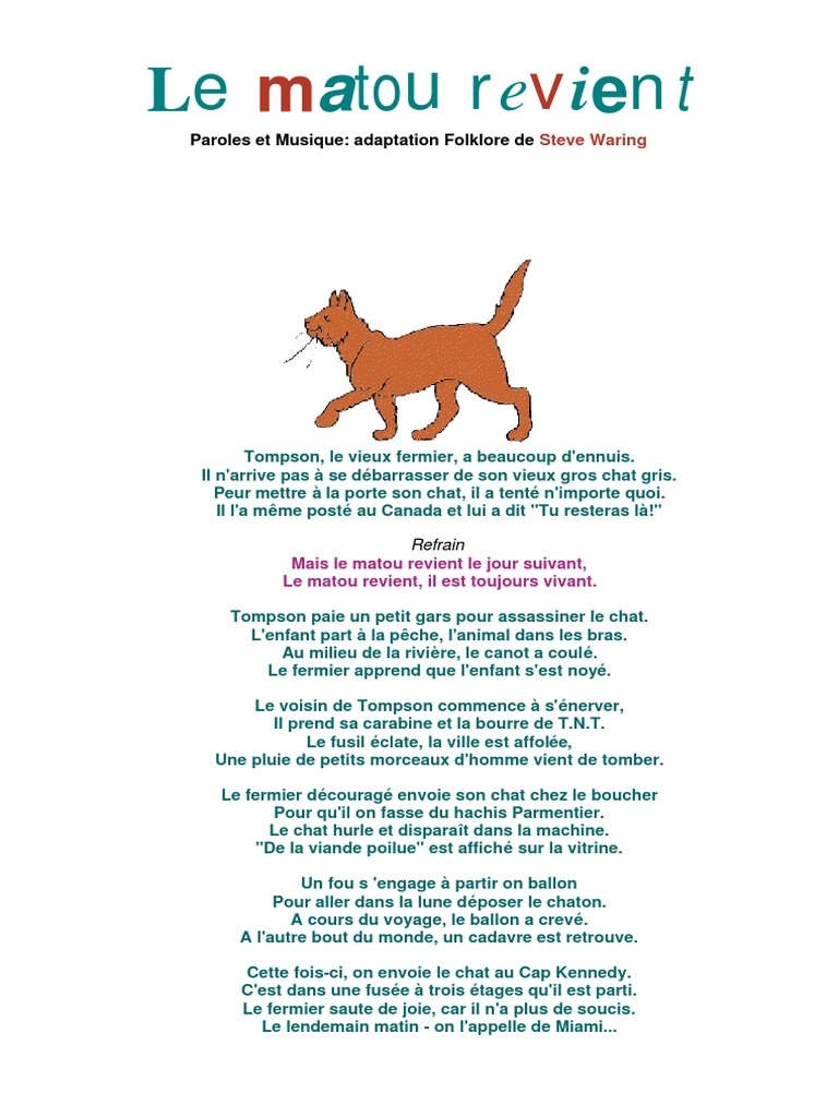 O Gato e a Poesia – Le chat et la Poésie (27) Poesia de Jorge Magalhães (21) O gato e os cançonetistas – Le chat et le chansonniers (7) O gato e os Humoristas – Le chat et les Humoristes () Os gatos de Stuart – Les chats de Stuart (5) O gato nos livros das minhas avós – Le chat dans les livres de mes grandmères (2)Chantal Le chien, le chat Je sais bien que vous ne vous supportez pas Le chien, le chat Vous (paroles de la chanson Le chien, le chat – CHANTAL GOYA)Mar 10, 15 · There is no strumming pattern for this song yet Create and get 5 IQ PassePartout Émission TV mythique québécoise Monsieur Le Chat Paroles Michèle Poirier, musique PF Brault, 1978 Chanté par PasseCarreau bien sûr Am Em Ditesmoi Monsieur le chat F C G Où est Madame chatte Am Em Si vous ne le savez pas F G Donnez votre langue au